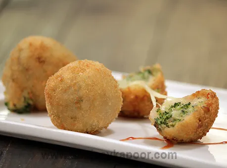आलू, ब्रॉकॉली और पार्मेज़ान चीज़ के मिश्रण के गोलों में मॉझ़ॅरेल्ला चीज़ भरकर तलें